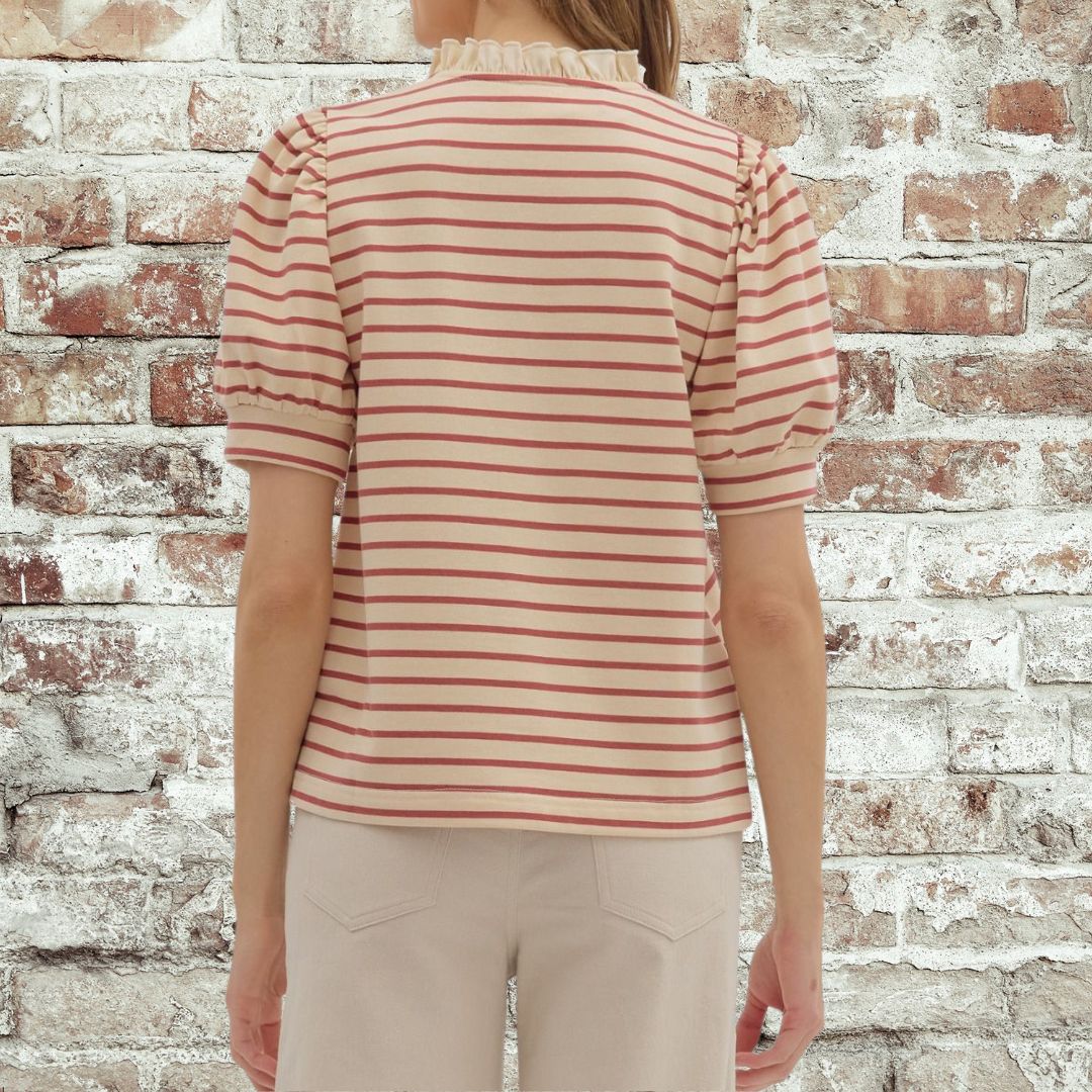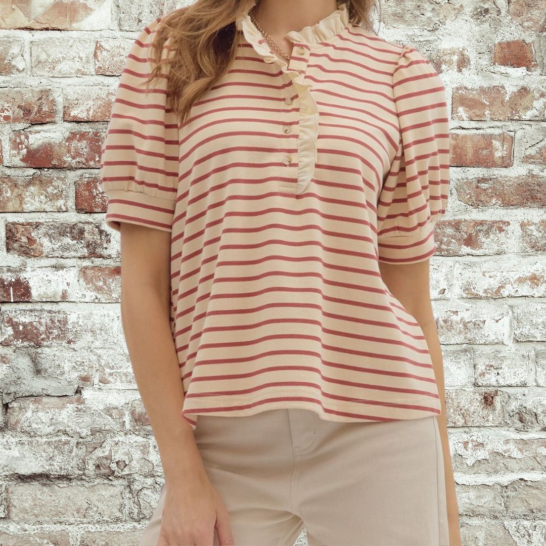 Sweet meets statement. This lightweight knit top features a charming brick-toned stripe pattern, short puff sleeves, and a playful contrast ruffle neckline with button-front closure. Unlined and non-sheer for easy wear, it's the perfect piece to dress up your denim or tuck into skirts for a feminine, put-together look with just the right touch of flair.