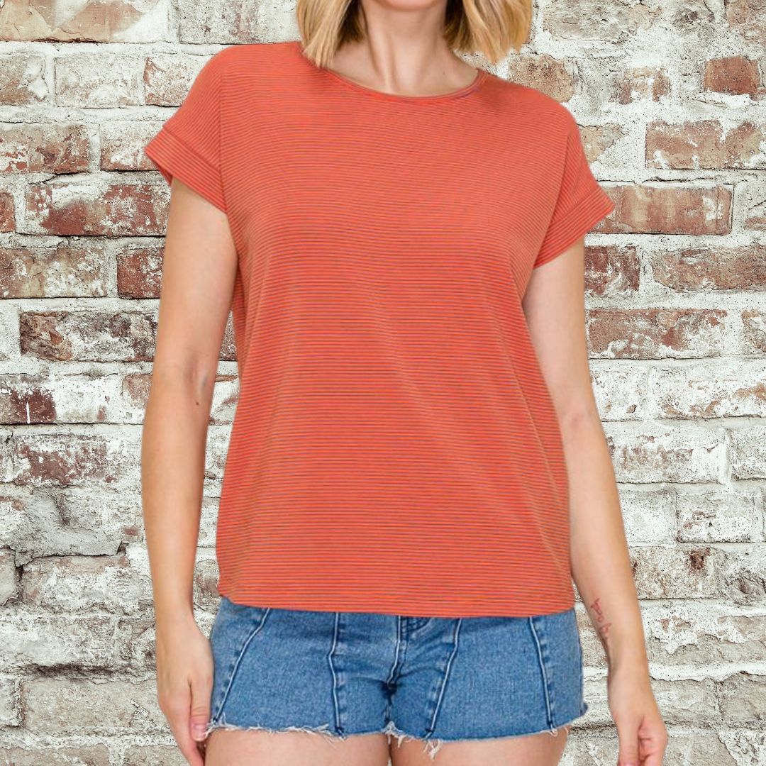 Add a pop of color to your wardrobe with this vibrant orange top. Made from soft pinstriped jersey fabric, it offers a comfortable and lightweight feel that’s perfect for everyday wear. Designed with short sleeves and a stylish twisted keyhole back detail, this top brings a unique and modern touch to a classic silhouette.