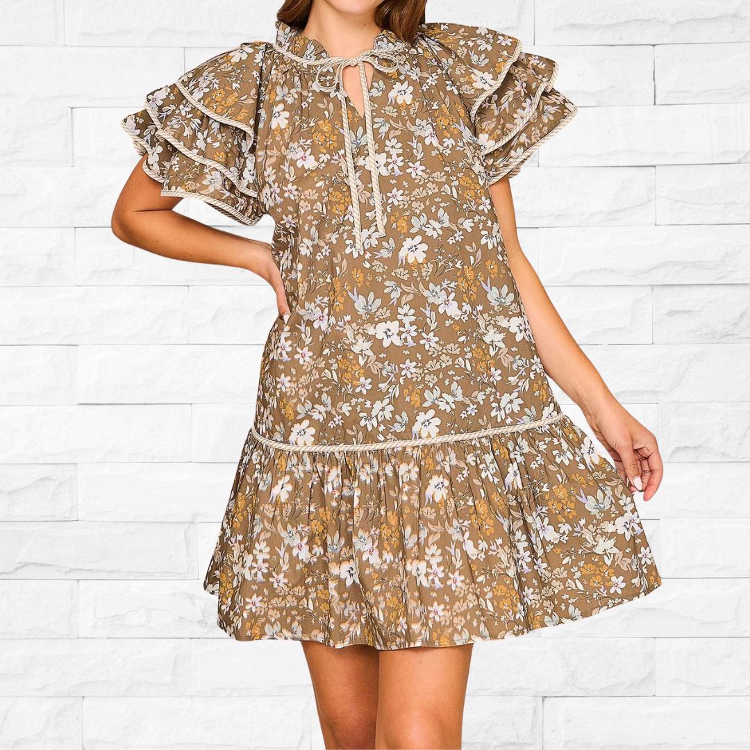 Feminine and effortlessly flirty, this floral babydoll dress features a tie-front keyhole neckline and airy layered ruffle sleeves. Its flowy silhouette and tiered ruffle hem add movement and charm, perfect for warm days or layered looks. Lightweight and unlined for breathable comfort.
